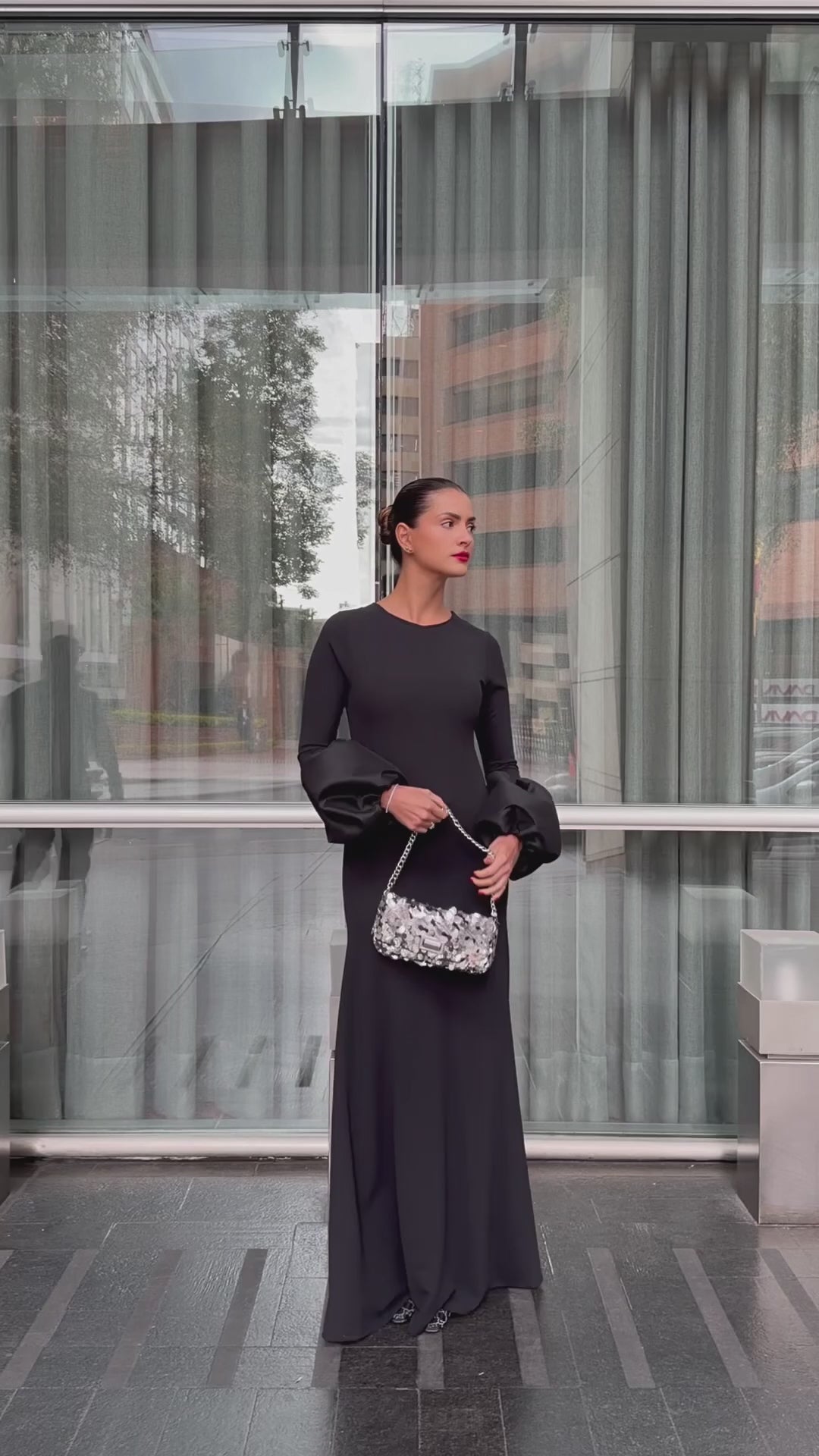 Vestido largo confeccionado en crepé, con caída en línea A y detalles en las mangas en tafetán que aportan estructura y contraste.