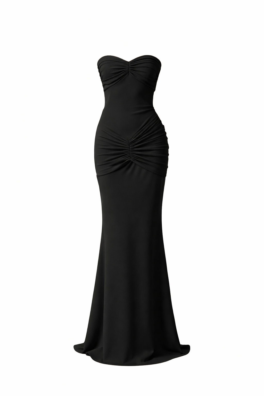 Confeccionado en tela licrada con efecto crepé al tacto, este diseño incorpora nuestra característica elegida tanto en la parte superior como en la inferior, creando una silueta favorecedora. Además, el vestido presenta un sutil vuelo en la parte baja, que añade movimiento y elegancia al diseño.
